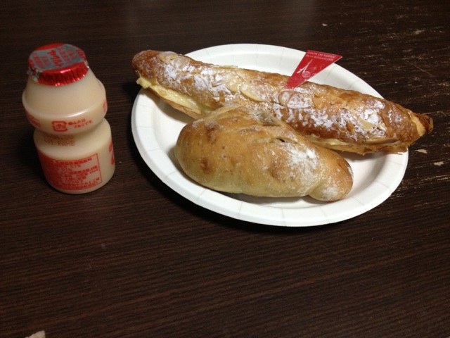 ↓朝食は前日に購入したポンパドウルのパン二つ。
